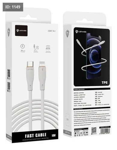 كابل شحن سريع (FAST CABLE) بقدرة 18W، يستخدم لنقل الطاقة والبيانات، بتوصيل من USB Type-C إلى Lightning، مما يعني أنه مخصص بشكل أساسي لأجهزة Apple مثل iPhone وiPad