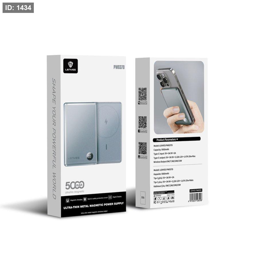 بوربانك لاسلكي مغناطيسي LENYES PW037D بقوة 15 واط وسعة 5000 مللي أمبير، مزود بمنفذ Type-C بقوة قصوى 20 واط