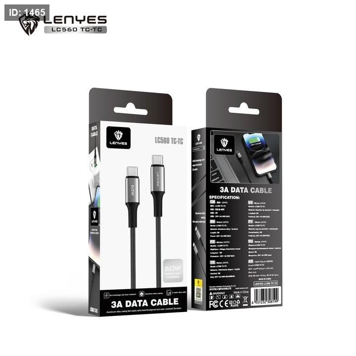 كابل شحن ونقل بيانات من LENYES موديل LC560 TC-TC، بمنفذ Type-C إلى Type-C، يوفر شحن سريع وأداء عالي مع تصميم متين للاستخدام اليومي.