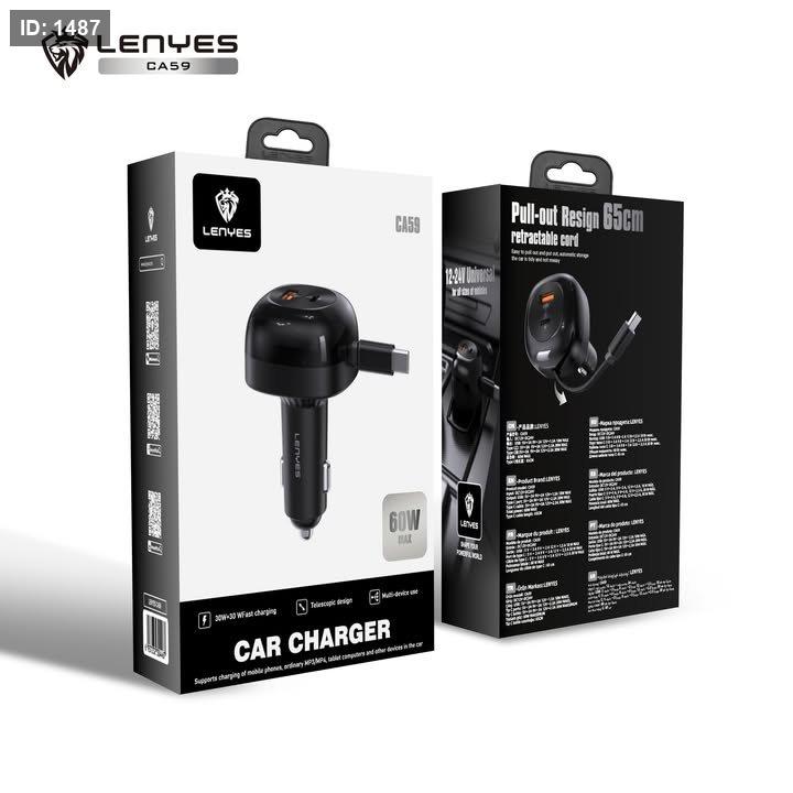 شاحن سيارة سريع ومريح مزوّد بمنفذ USB‑A ومنفذ Type‑C مع كابل مدمج قابل للسحب، مصمم لشحن الهواتف الذكية والأجهزة الأخرى بسرعة وكفاءة أثناء القيادة.